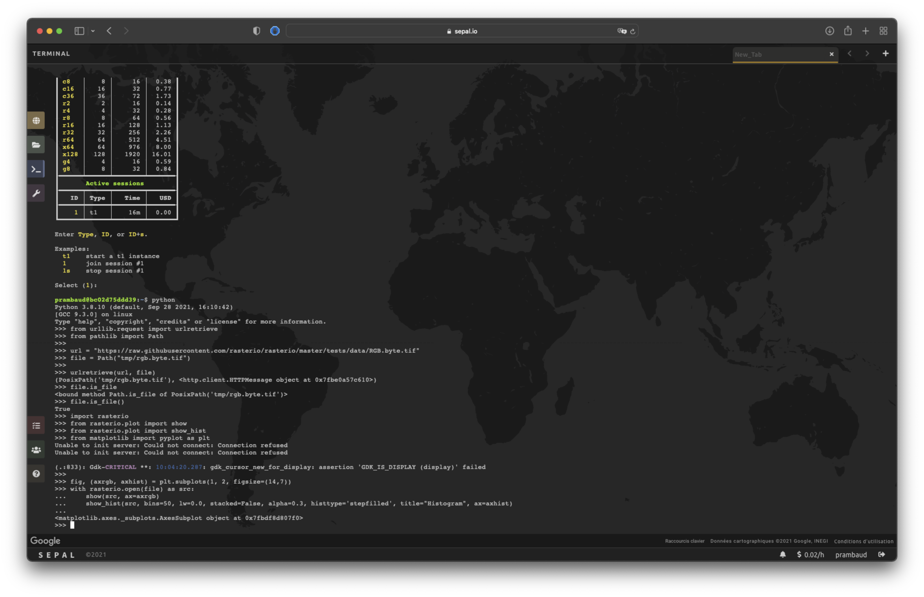 SEPAL instances run on focal Ubuntu machines and thus provide a fully functional Python 3.10.12 environment, which is accessible through Jupyter Notebook, JupyterLab or the terminal: