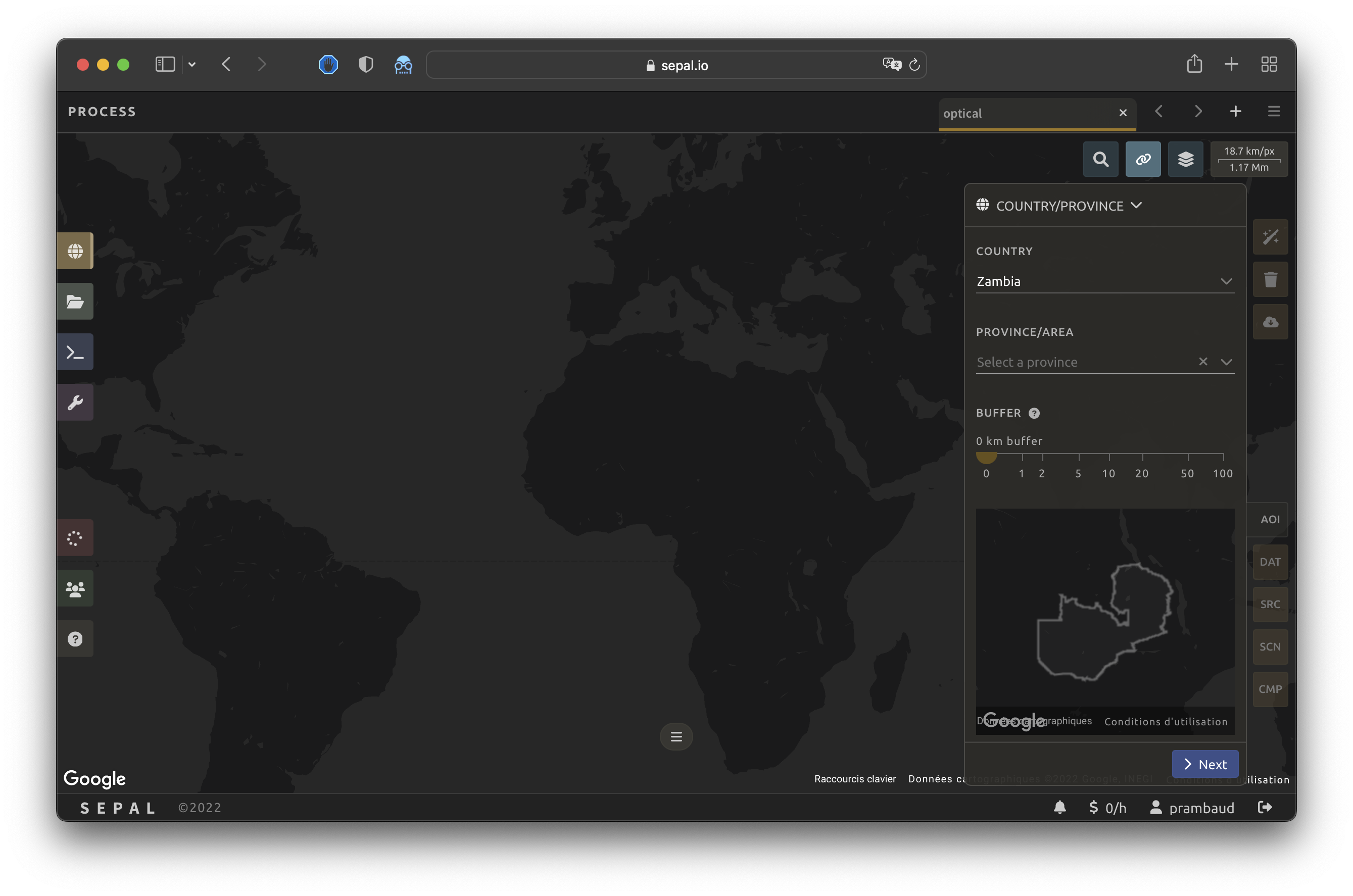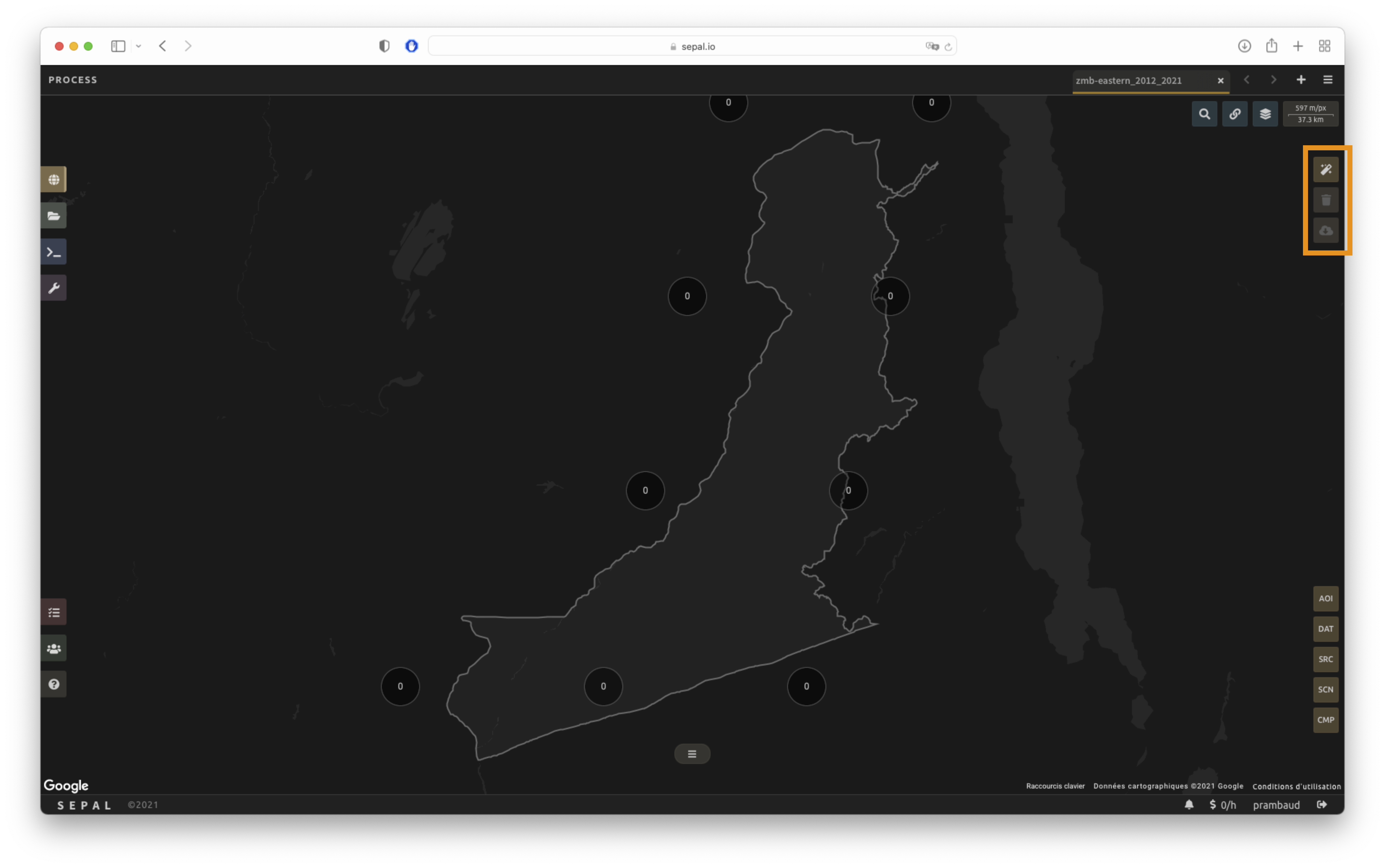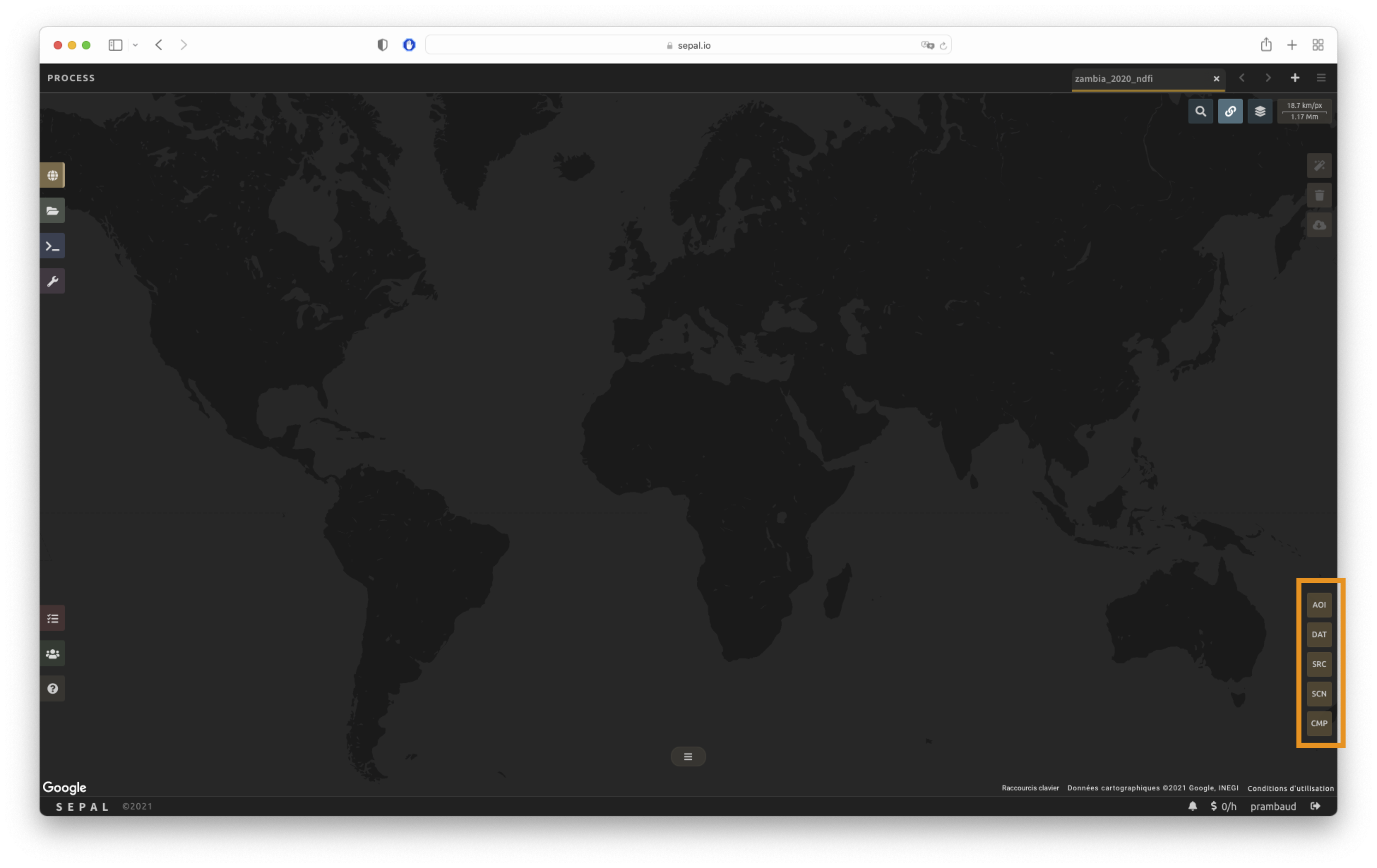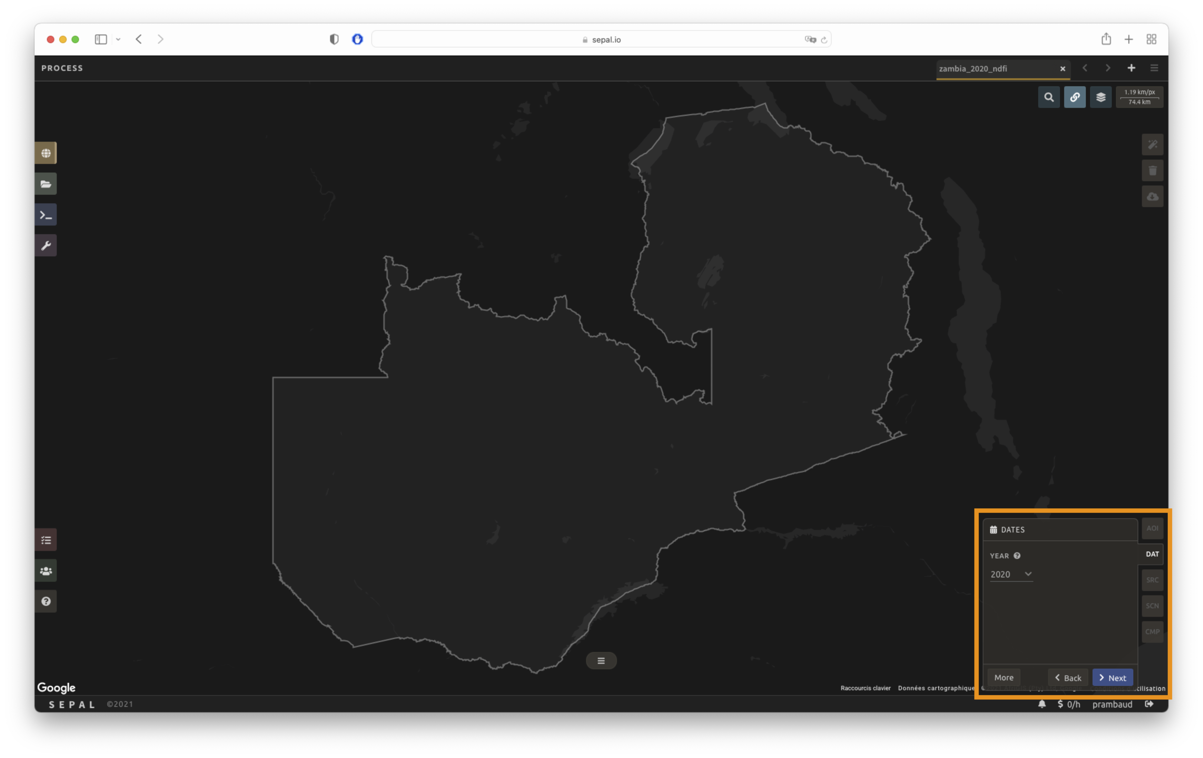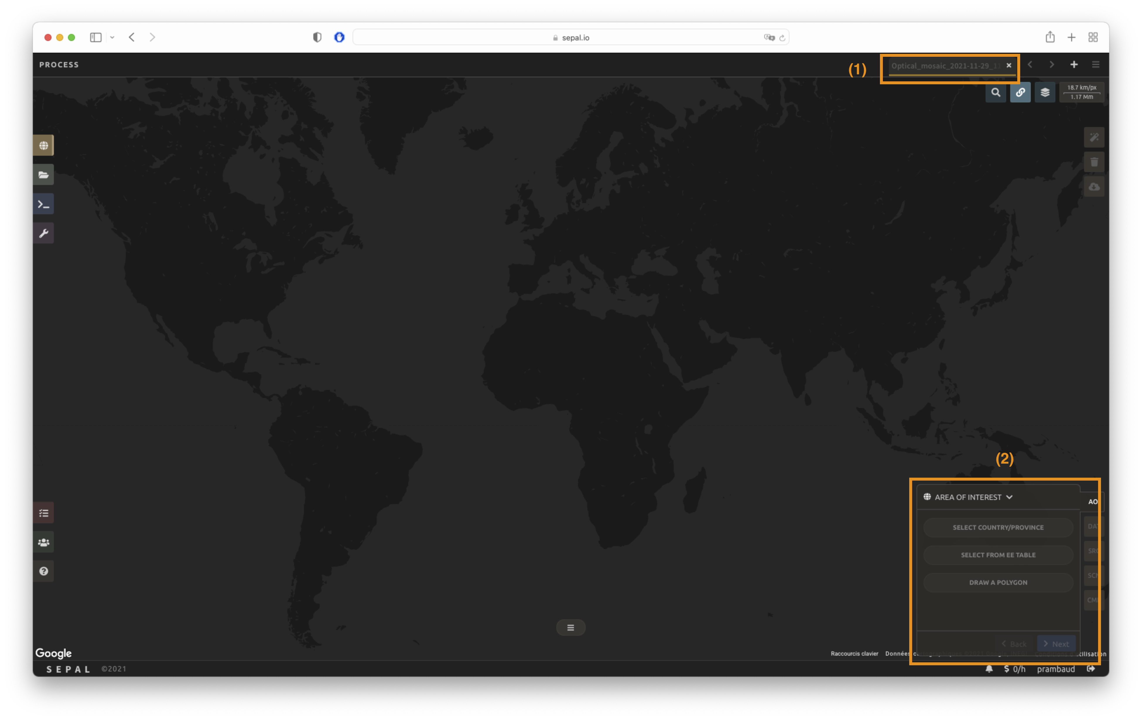 Once the mosaic recipe is selected, SEPAL will display the recipe process in a new tab (see 1 in the image below) and the AOI selection window will appear in the lower right (2).