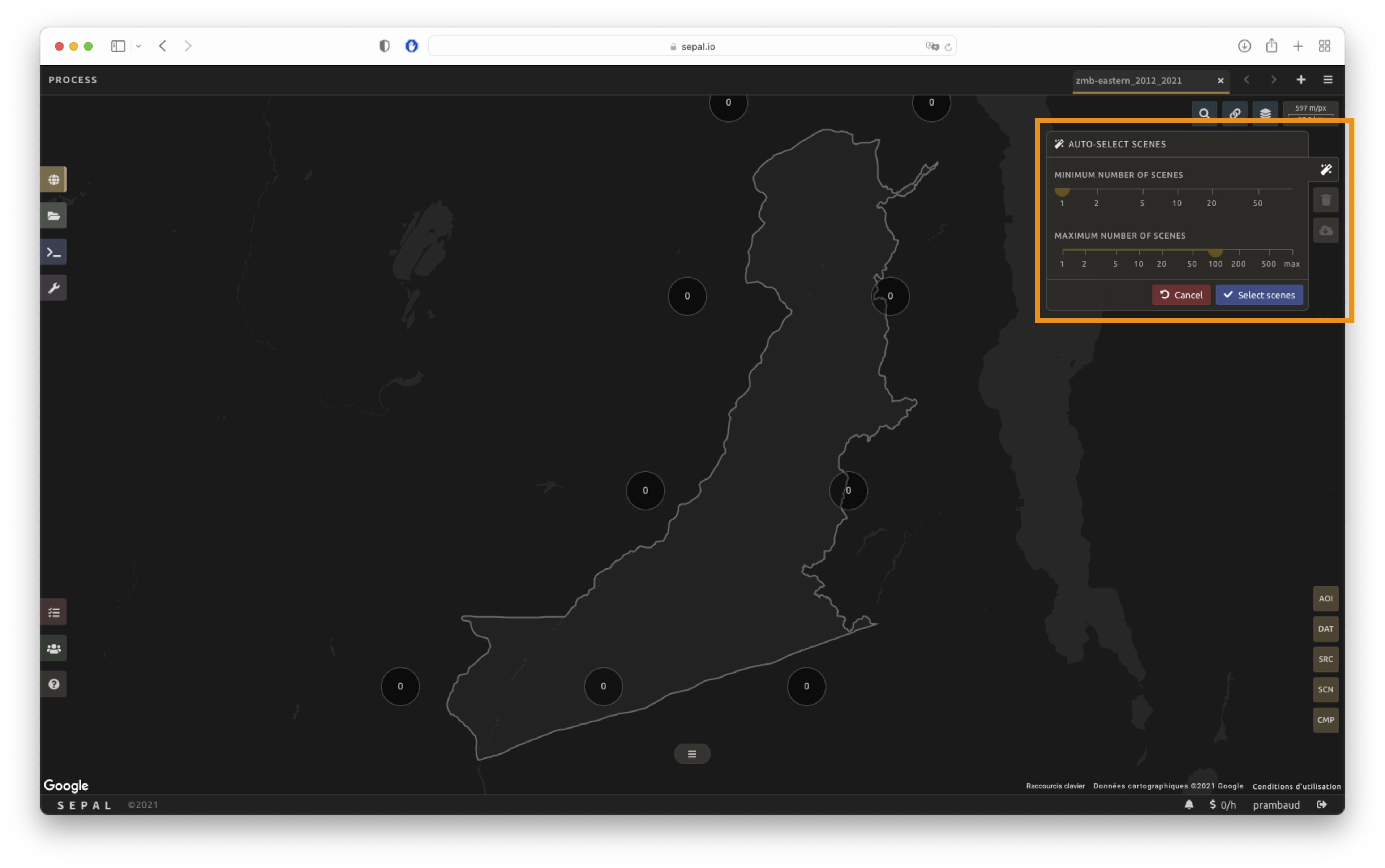 To create a mosaic, select the scenes that will be used to compute each pixel value of the mosaic. SEPAL provides a user-friendly interface that will guide you through the selection process. You don’t have to select the stack for every pixel; instead, SEPAL will clip the AOI in smaller pieces called Tiles. These tiles correspond to the native tiling system of your dataset and are displayed on the map with circled numbers in their centroid. Each number corresponds to the number of scenes available to build the mosaic tile. Hover over these circles to see the tile boundaries appear.