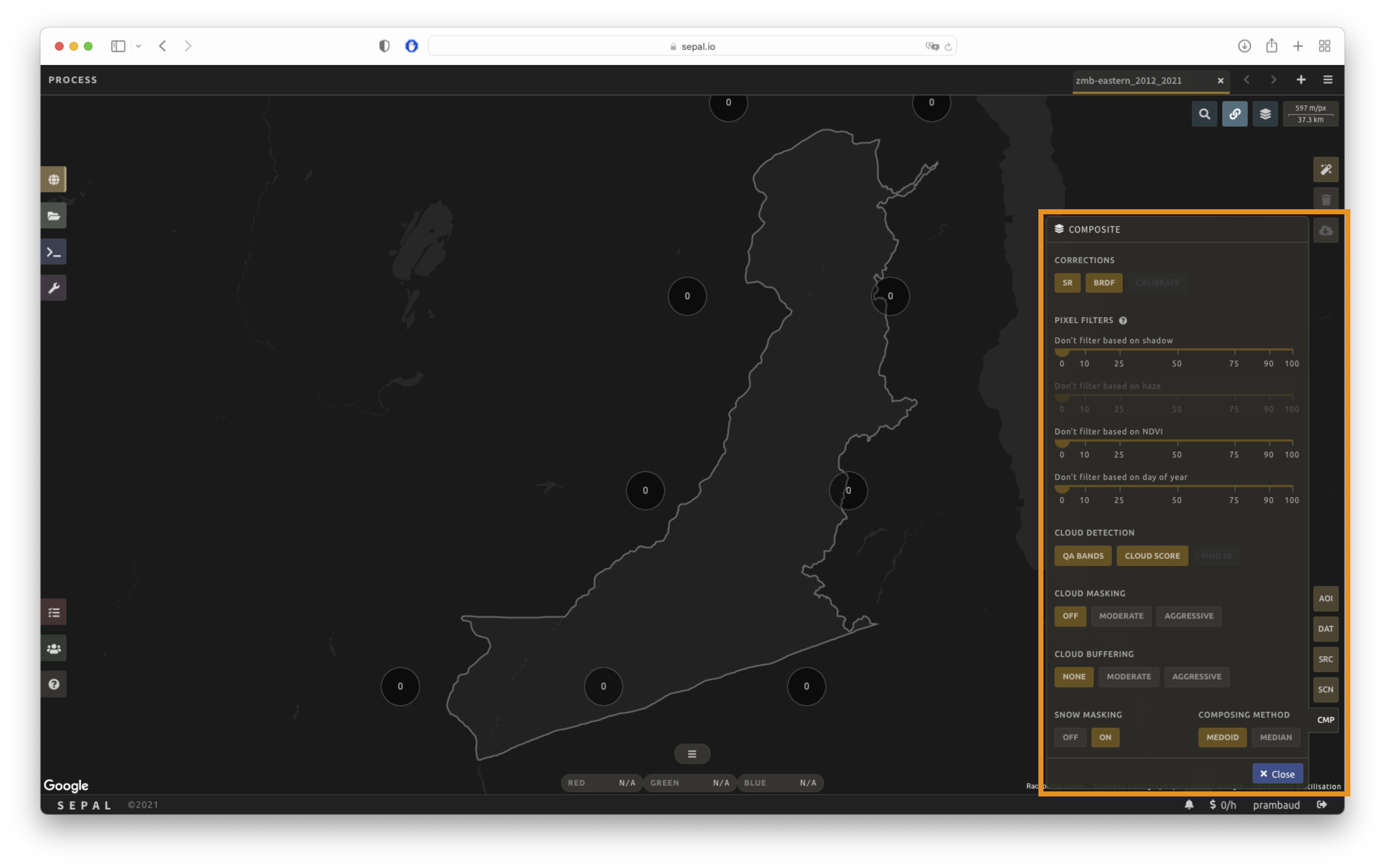 After filtering the stack of pixels, SEPAL will compute the median value on the different bands of the image. The composing method will define how the final pixel value is extracted.