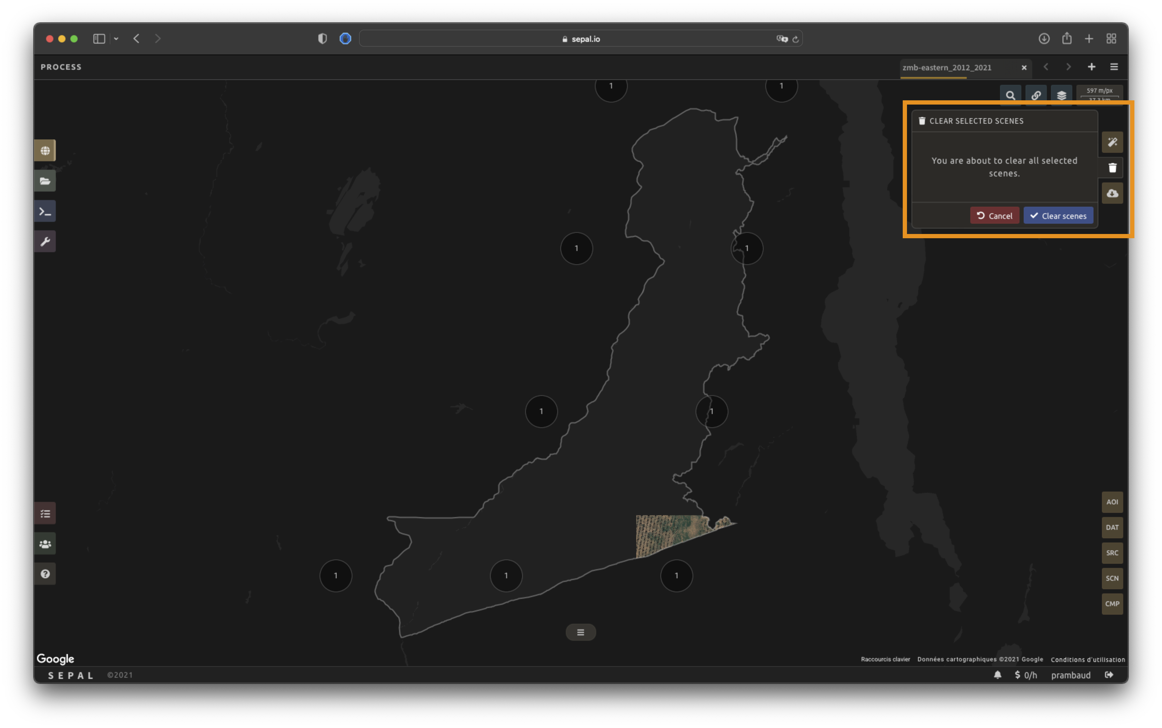Once you are happy with your selection, select the Apply button to close the window and use the selected scenes to compute the mosaic on this tile. When the window is closed, SEPAL resets the rendering of all tiles.