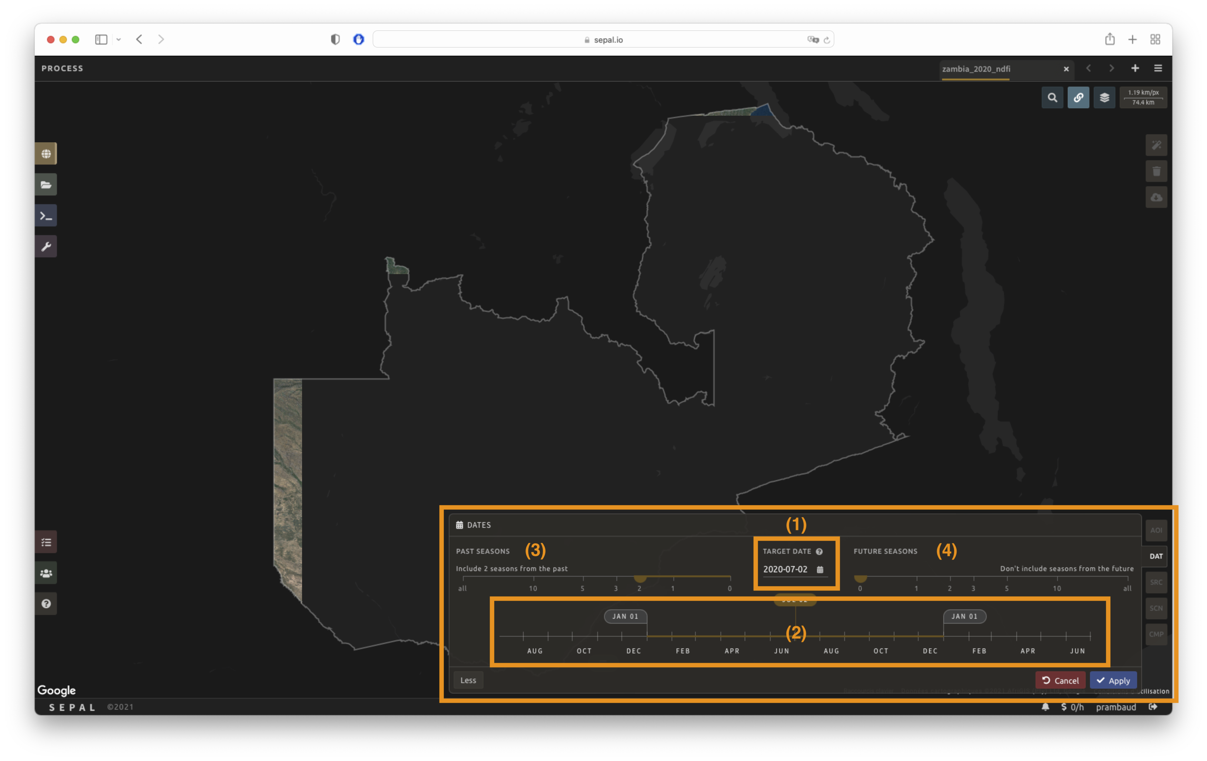 Using the main slider (2), define a season around the target date by identifying a start date and end date. SEPAL will then retrieve the mosaic images between those dates.