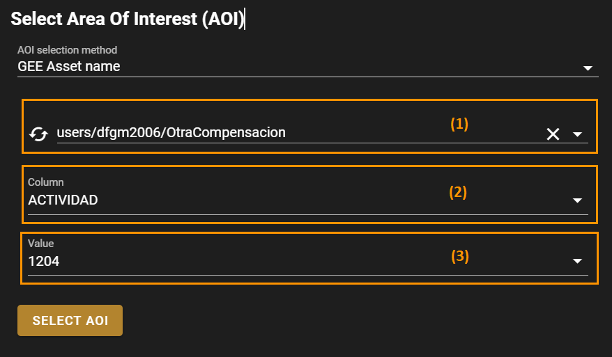 In the first dropdown list, provide a completely qualified GEE asset name (e.g. projects/gtfp-fao/assets/aoi_ecowas).