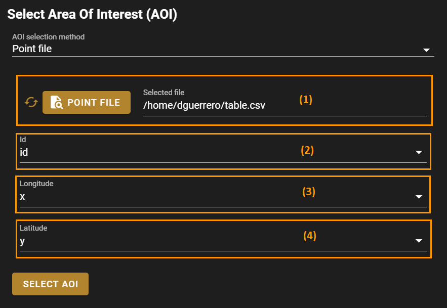 Use this method to load a single point or multipoint datasets. Select Point file in the Method dropdown list. Four new widgets will appear, including a File selector (1), and three dropdown lists: ID (2), Longitude (3), and Latitude (4).