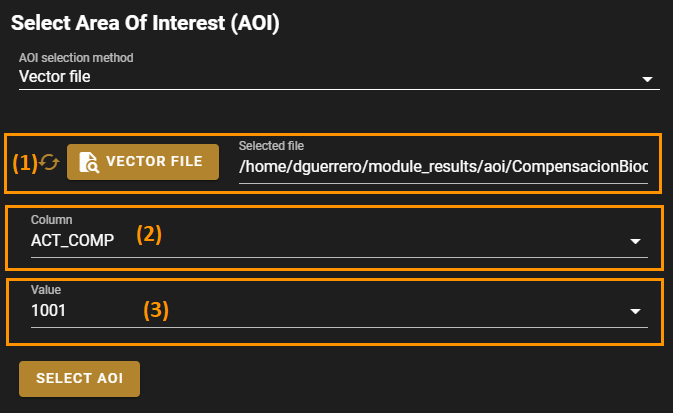 Available vector formats include: [.shp, .geojson, .gpkg, .kml]. Once selected, the module will transform its original coordinate system into EPSG:4326.