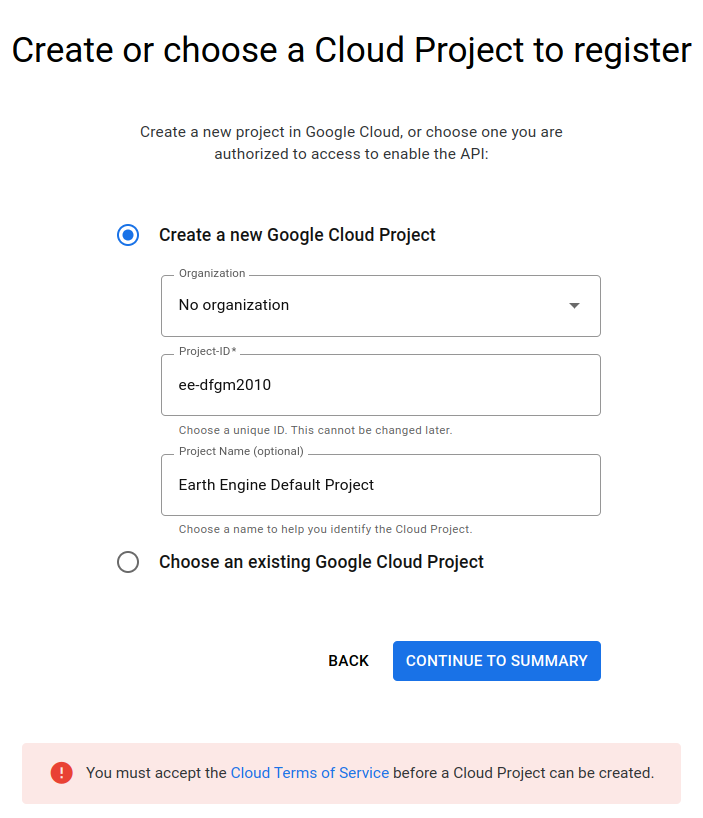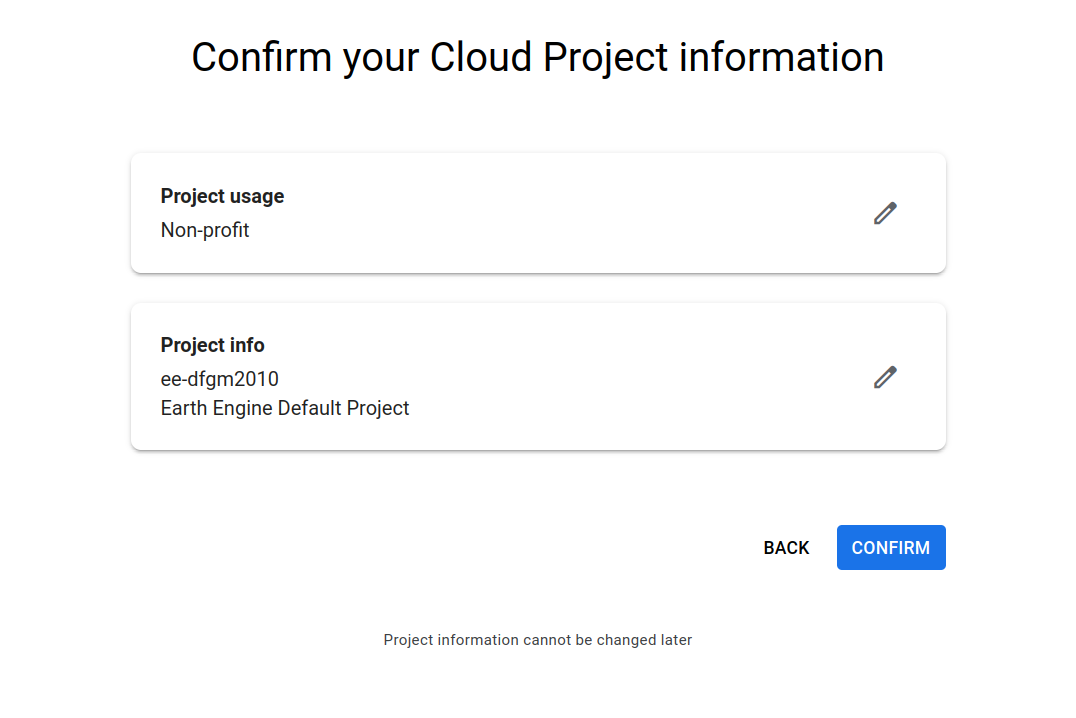 Finally, review the summary of your project and select Confirm. Your project is now registered and you can start using GEE.