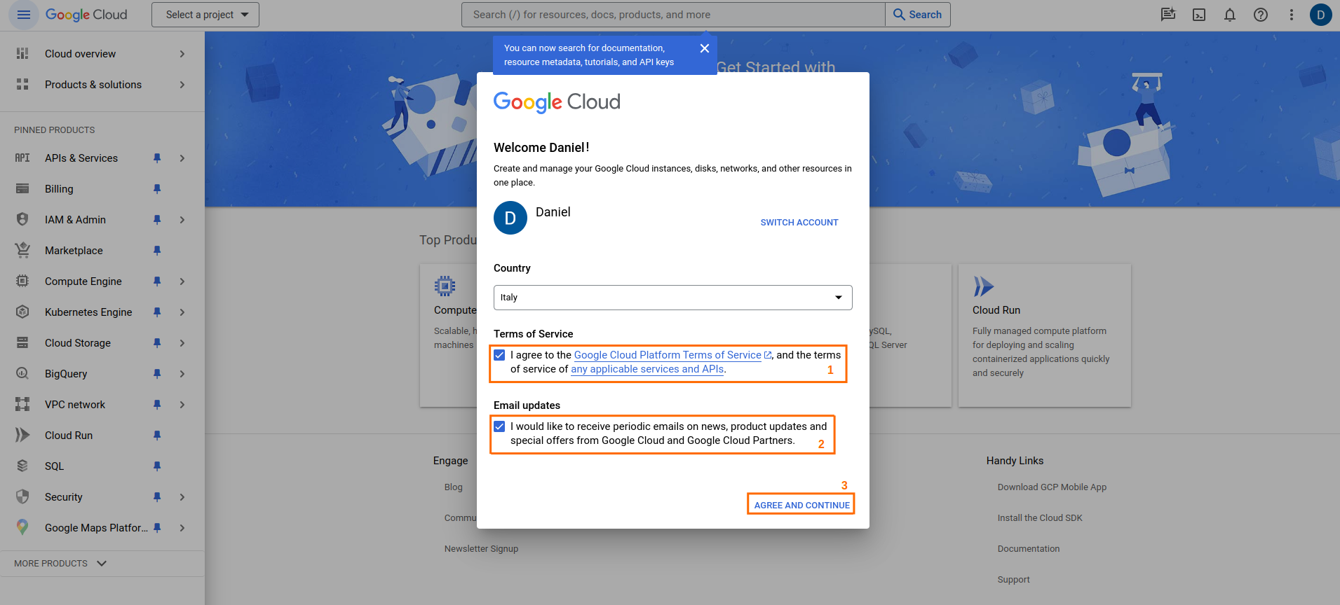 You will be redirected to the Google Cloud page, where you will see a welcome form. Read and accept the Terms of Service (1) and optionally (2) check the box for Email updates. Select Agree and continue (3).