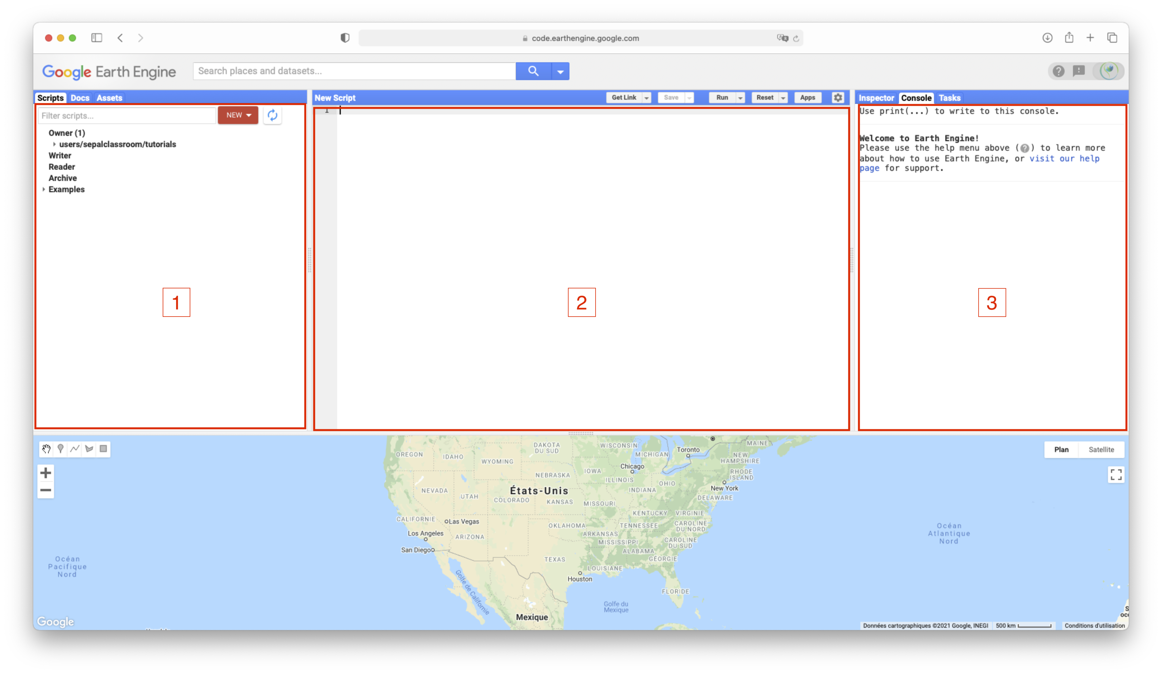 Zone 1: Provides you with access to your GEE account information, subdivided into three panes: