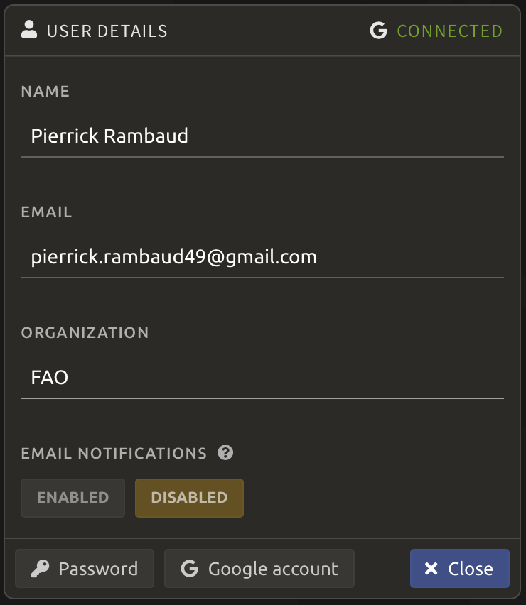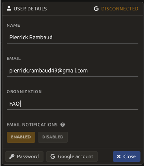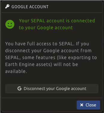 Next to the Google logo () in the upper-right corner of the User details pop-up window, the status of the connection between your GEE and SEPAL accounts is displayed (if you have not connected your accounts, it will read Disconnected).