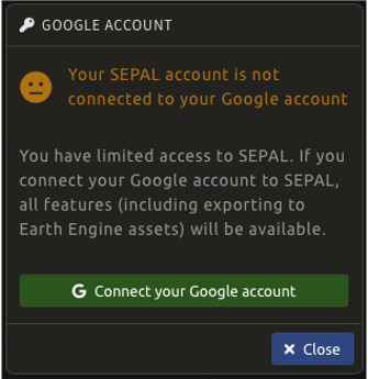 A GEE account is required to properly export images and data products as GEE assets or SEPAL applications using GEE from the SEPAL interface. A Google account is required to sign up for GEE.