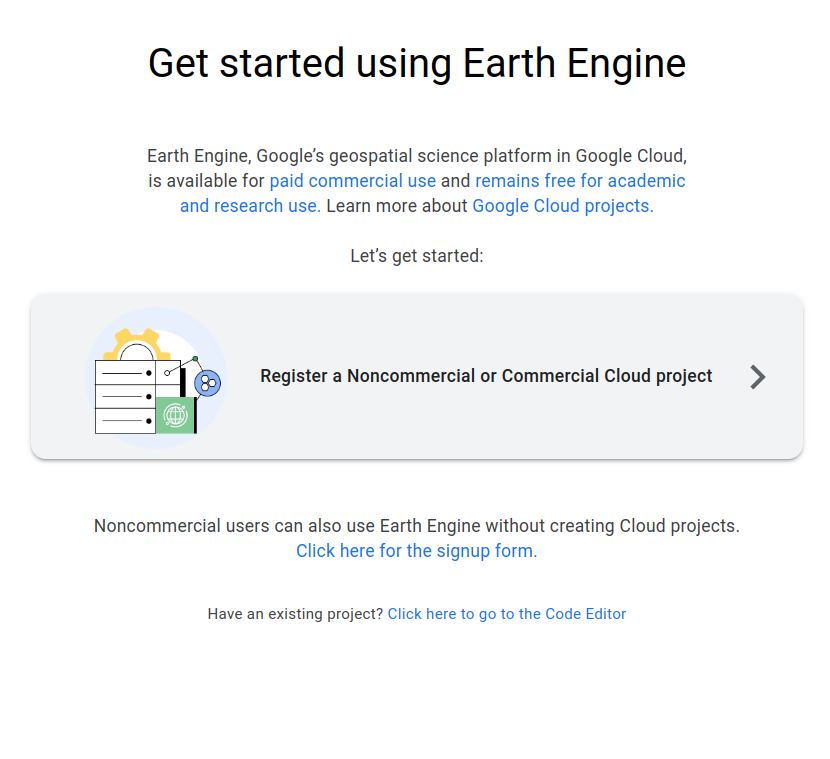 GEE now requires connecting to a Google Cloud project (GCP), available for paid commercial use or free for academic and research purposes.