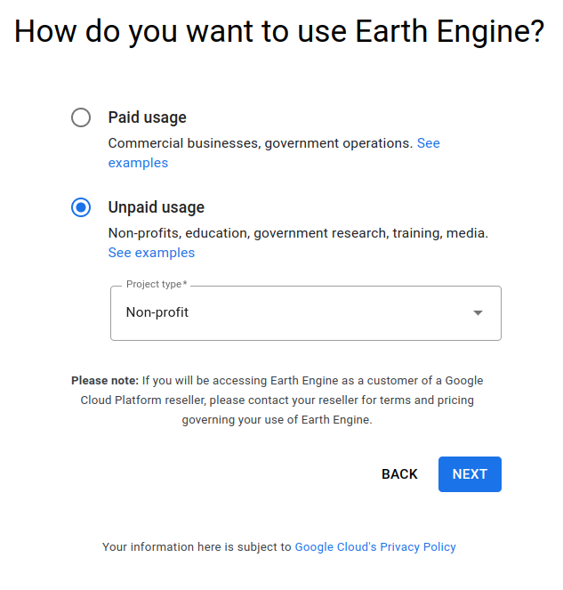 Select Unpaid usage and choose your project type (e.g. Academia & Research, Government, Non-profit). Select Next.