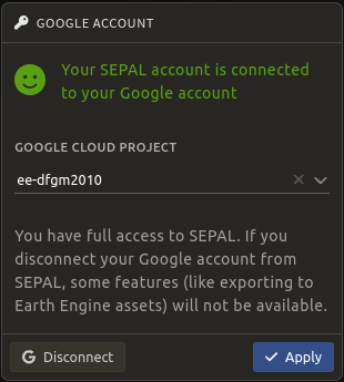If you want to change accounts or disconnect your GEE and SEPAL accounts: