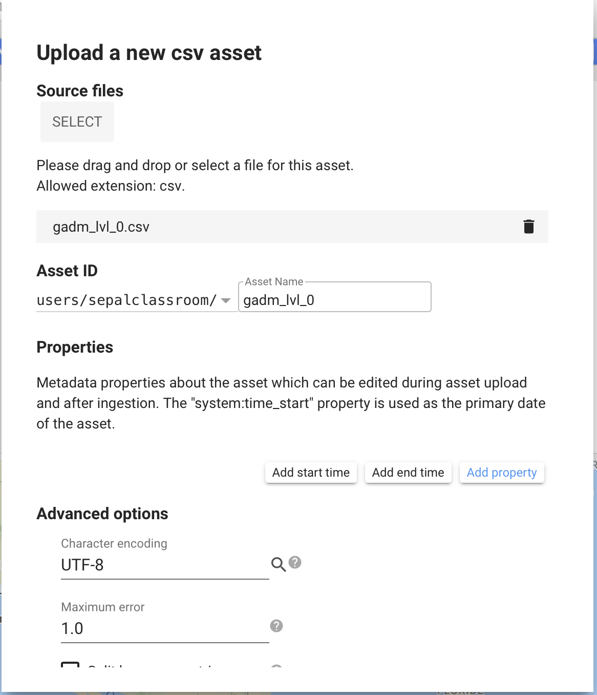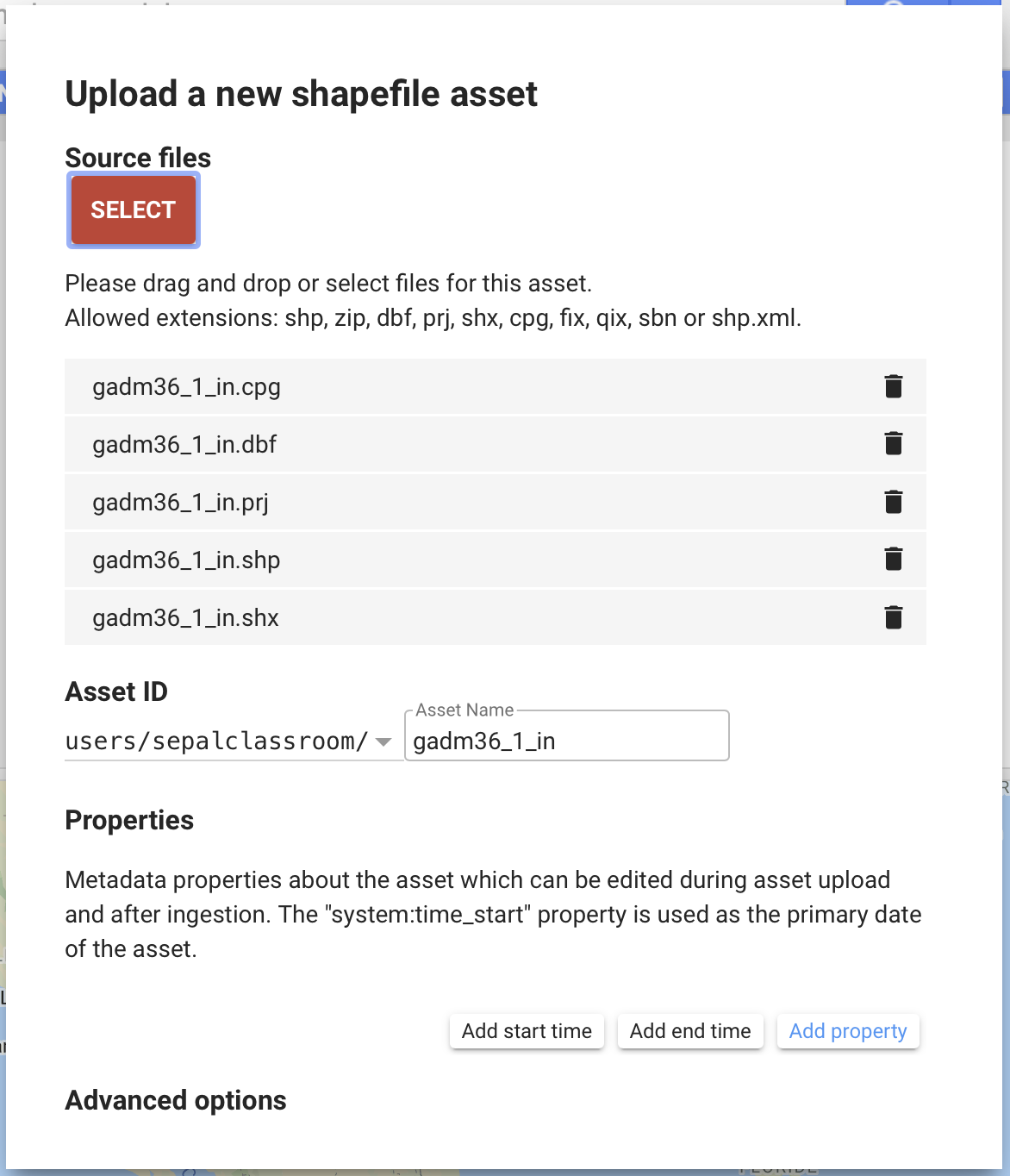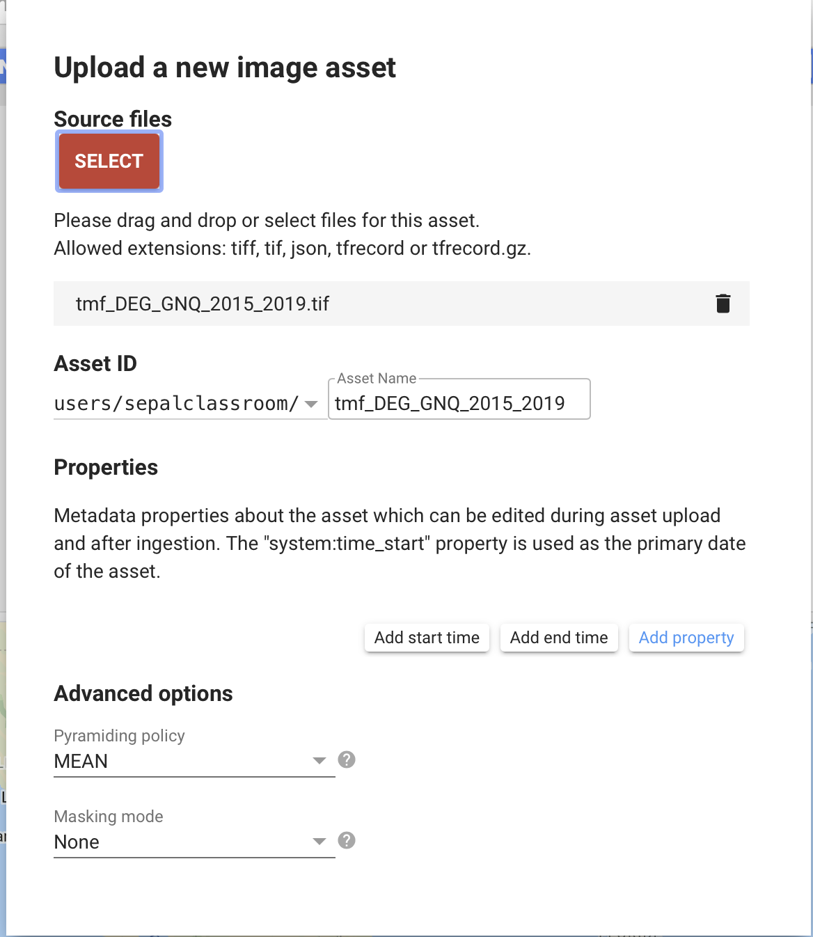 .tiff,.tif,.json,.tfrecordor.tfrecord.gz; the name of your asset can be changed in the next text field).