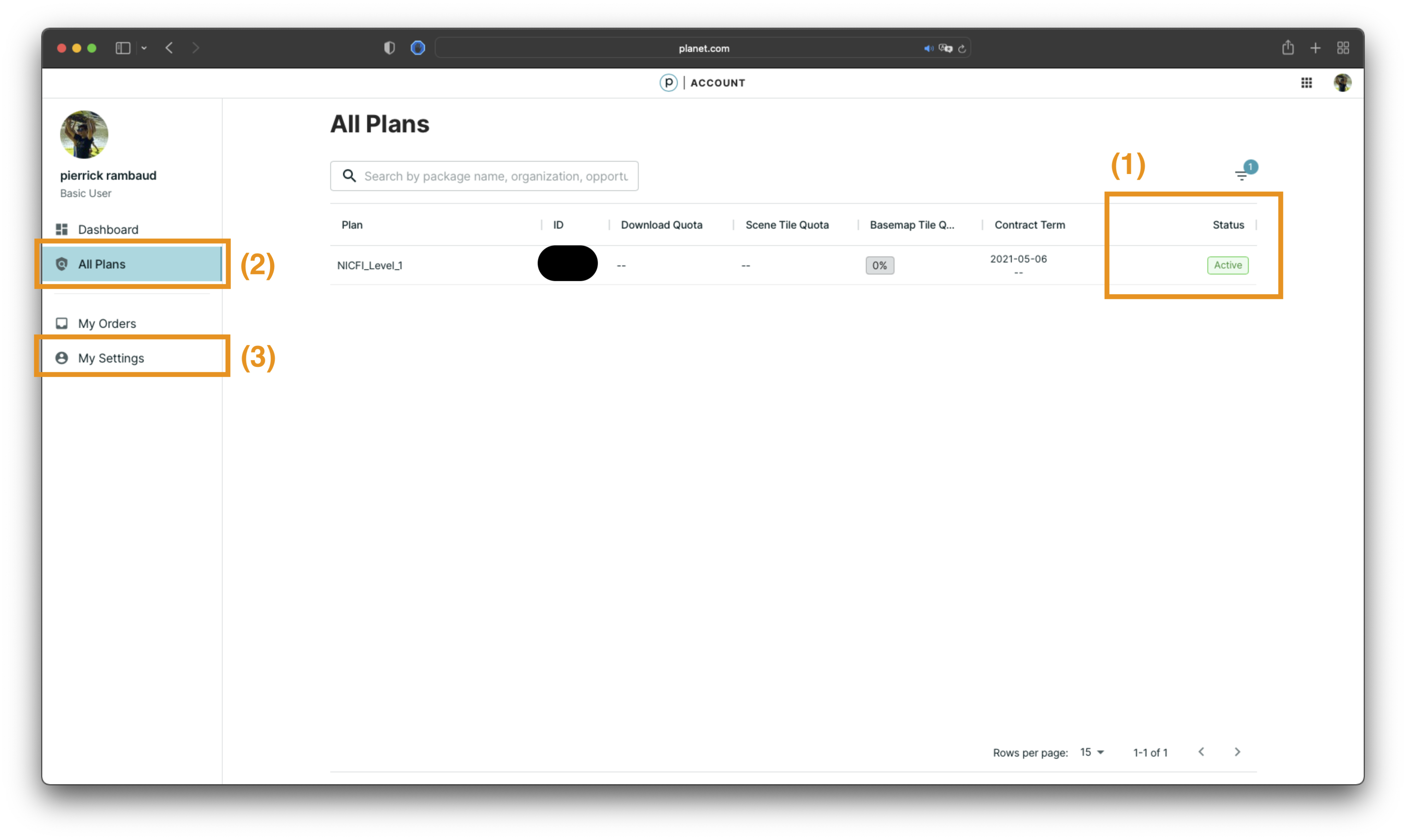 Select All plans (see 2 in figure below), which should activate NICFI level 1 data access (1 in figure below). If it does, select My settings (3 in figure below) and scroll down to the bottom of the page.