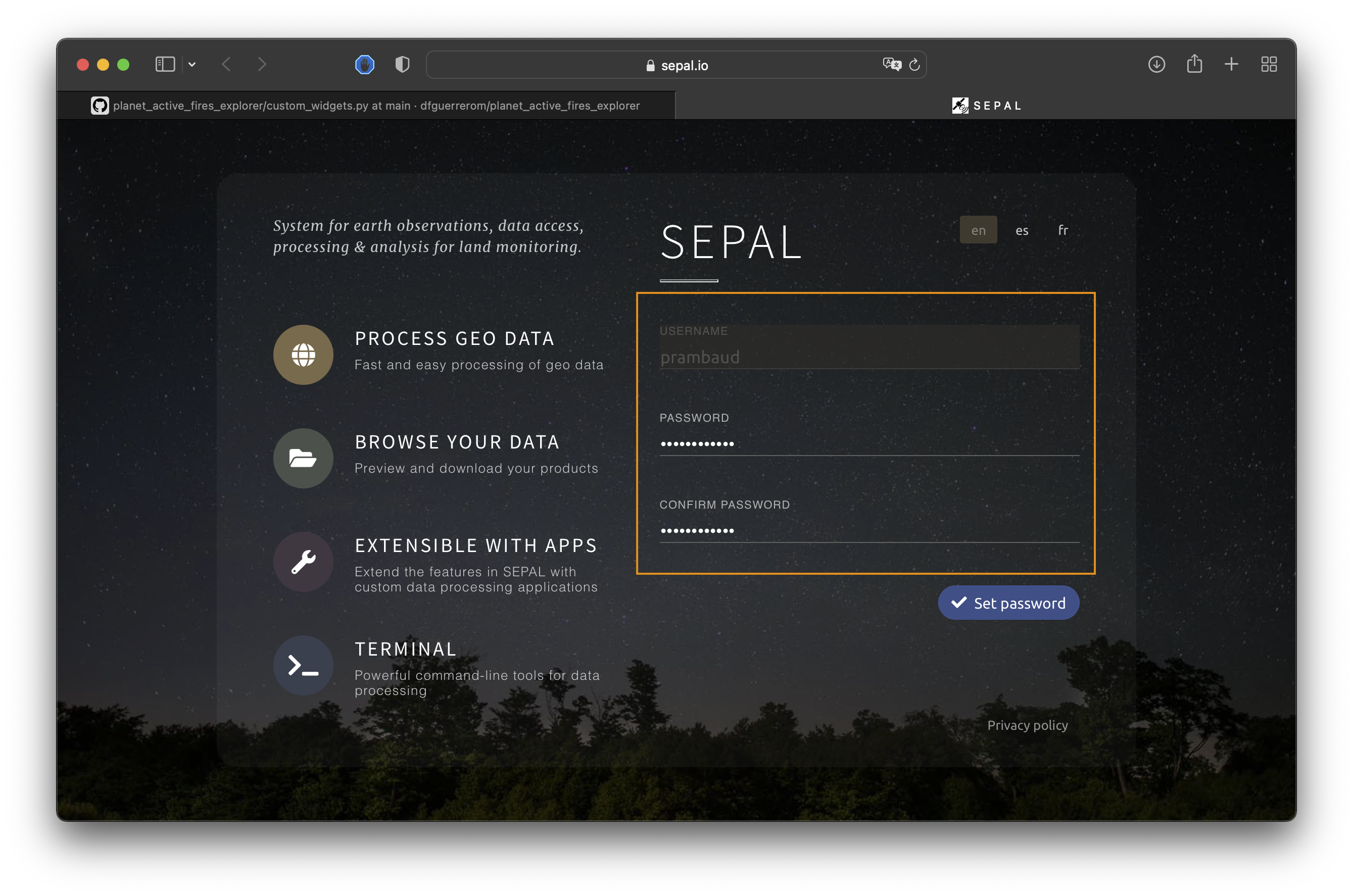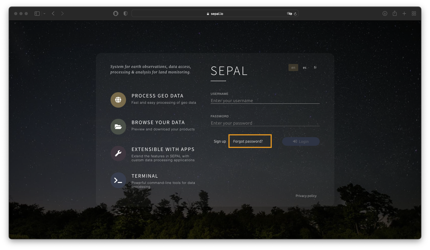 If you have forgotten the password for your SEPAL account, you can reset it by proving you have access to the email address associated with your account.