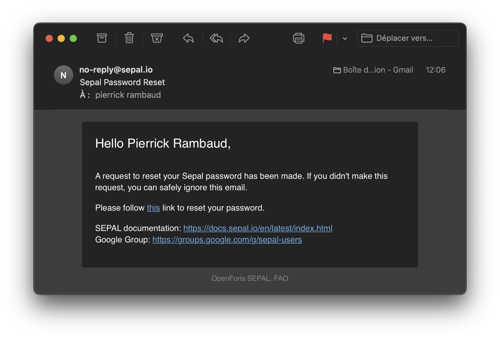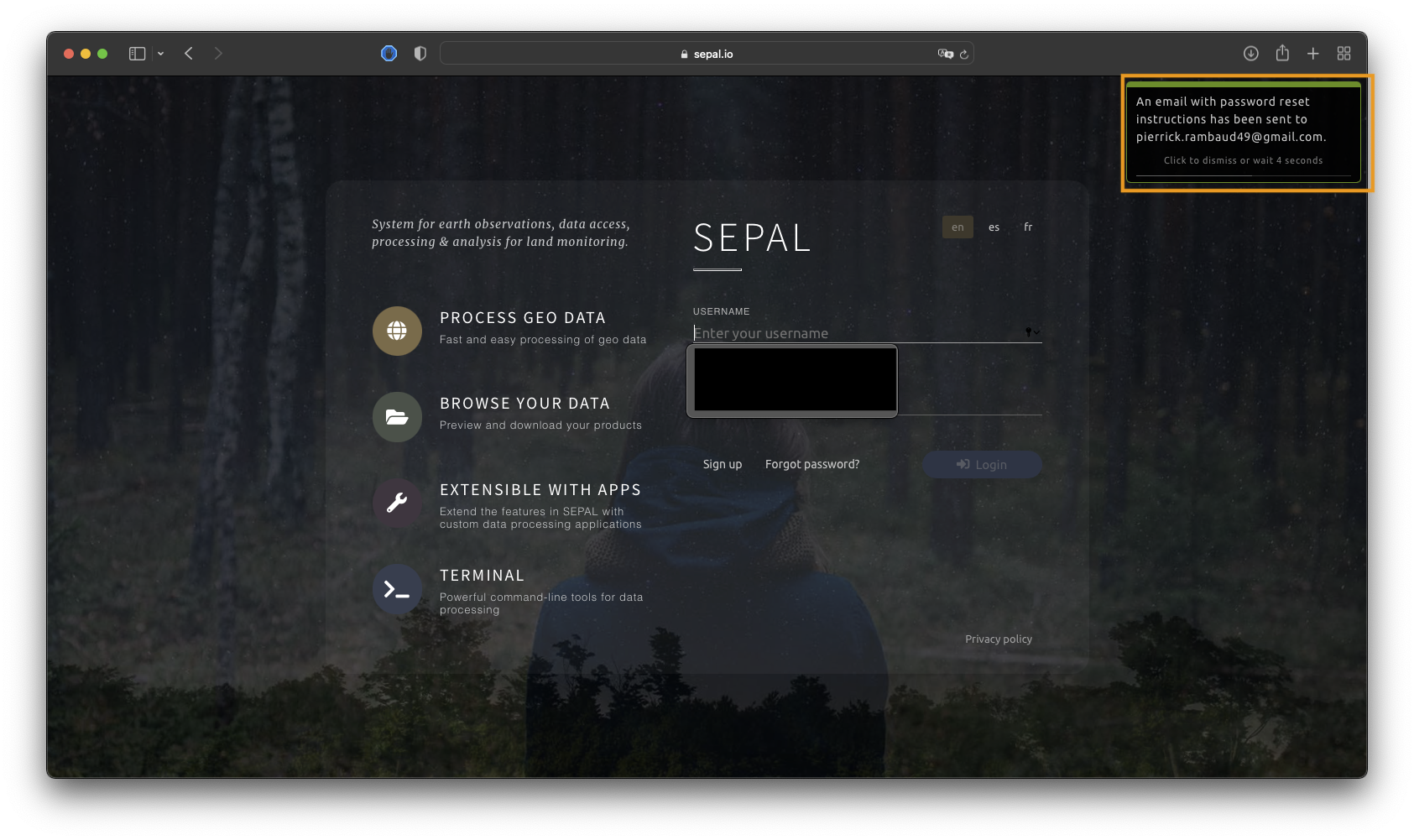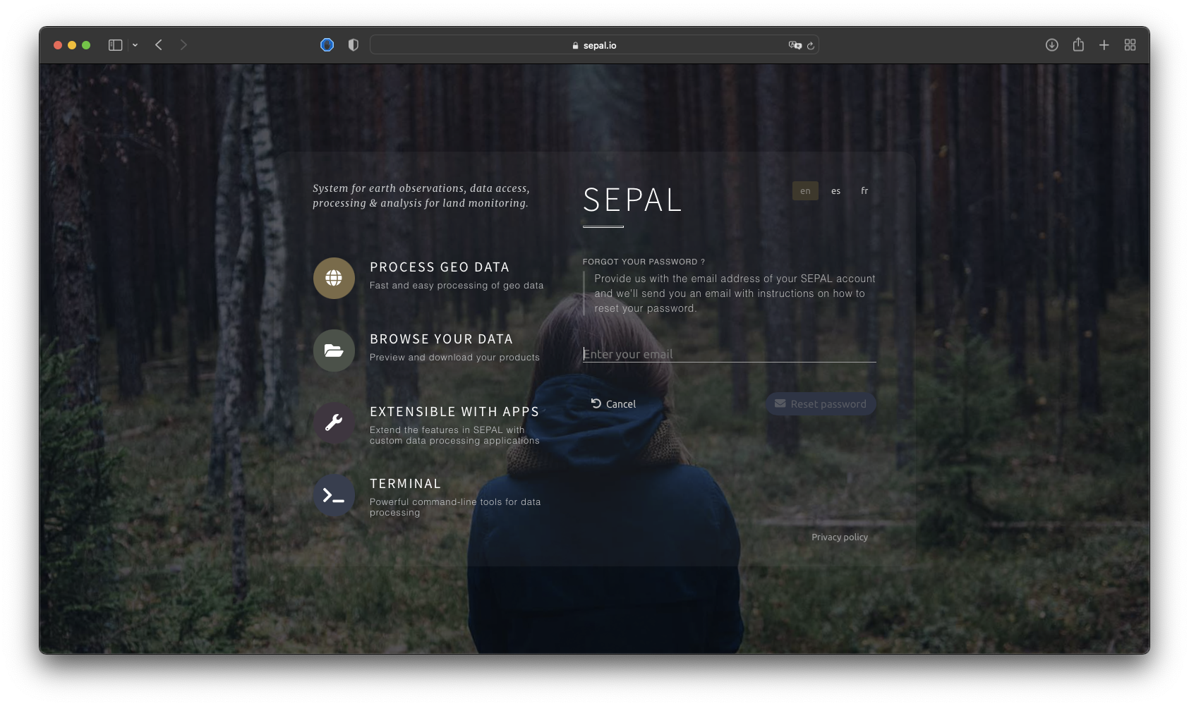 Enter the email address you used to register for SEPAL, then select Reset password.