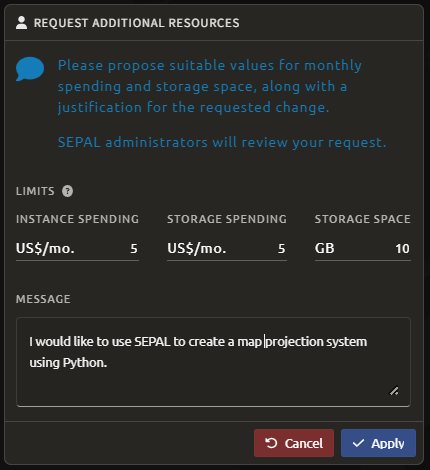 To use SEPAL modules and acesss the command line terminal and development tools like Jupyter or RStudio, you will need to request processing resources.