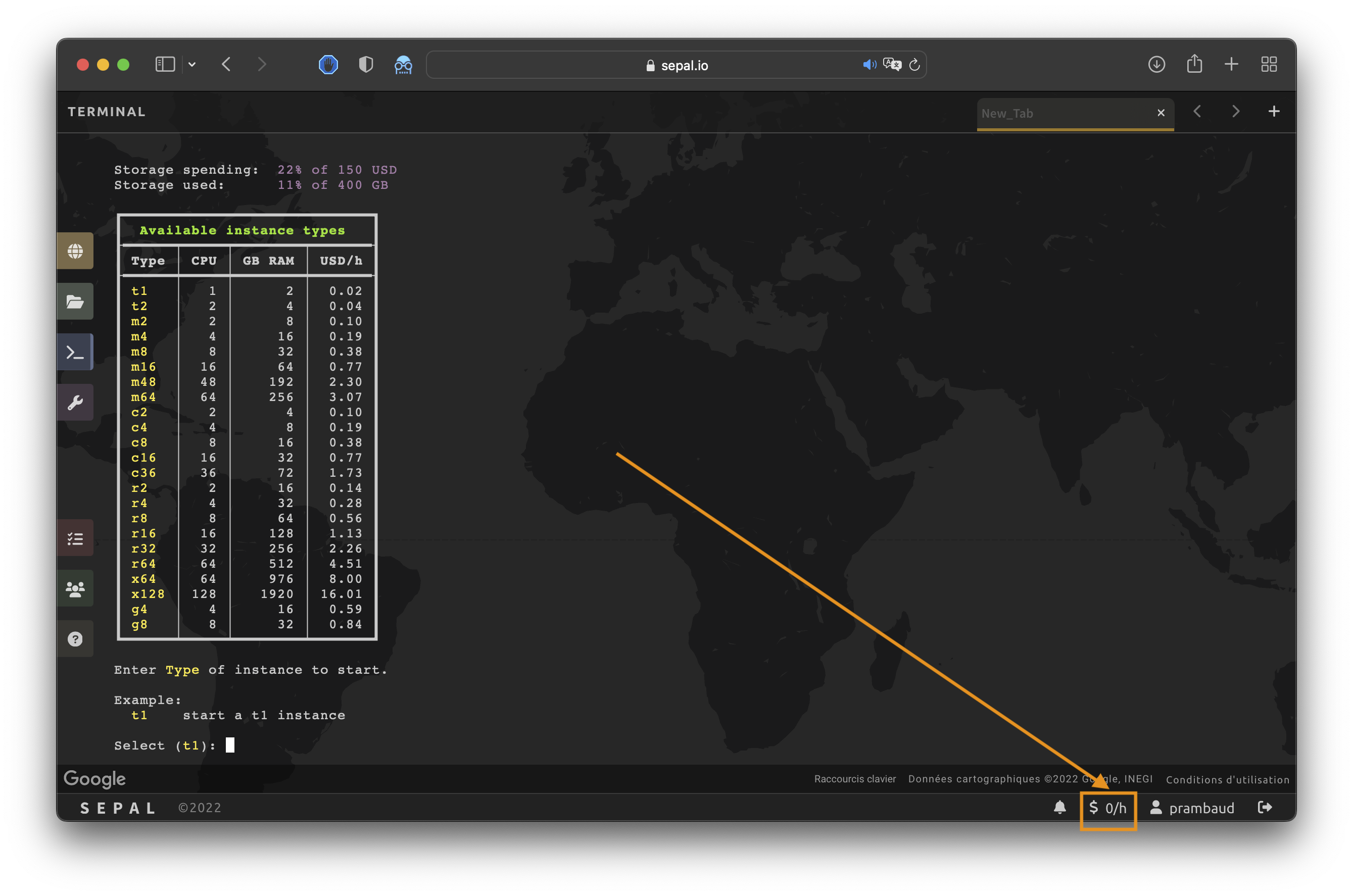 In Terminal, Apps or Process, select User report in the lower-right corner to see your current instance consumption: x.xx/h.
