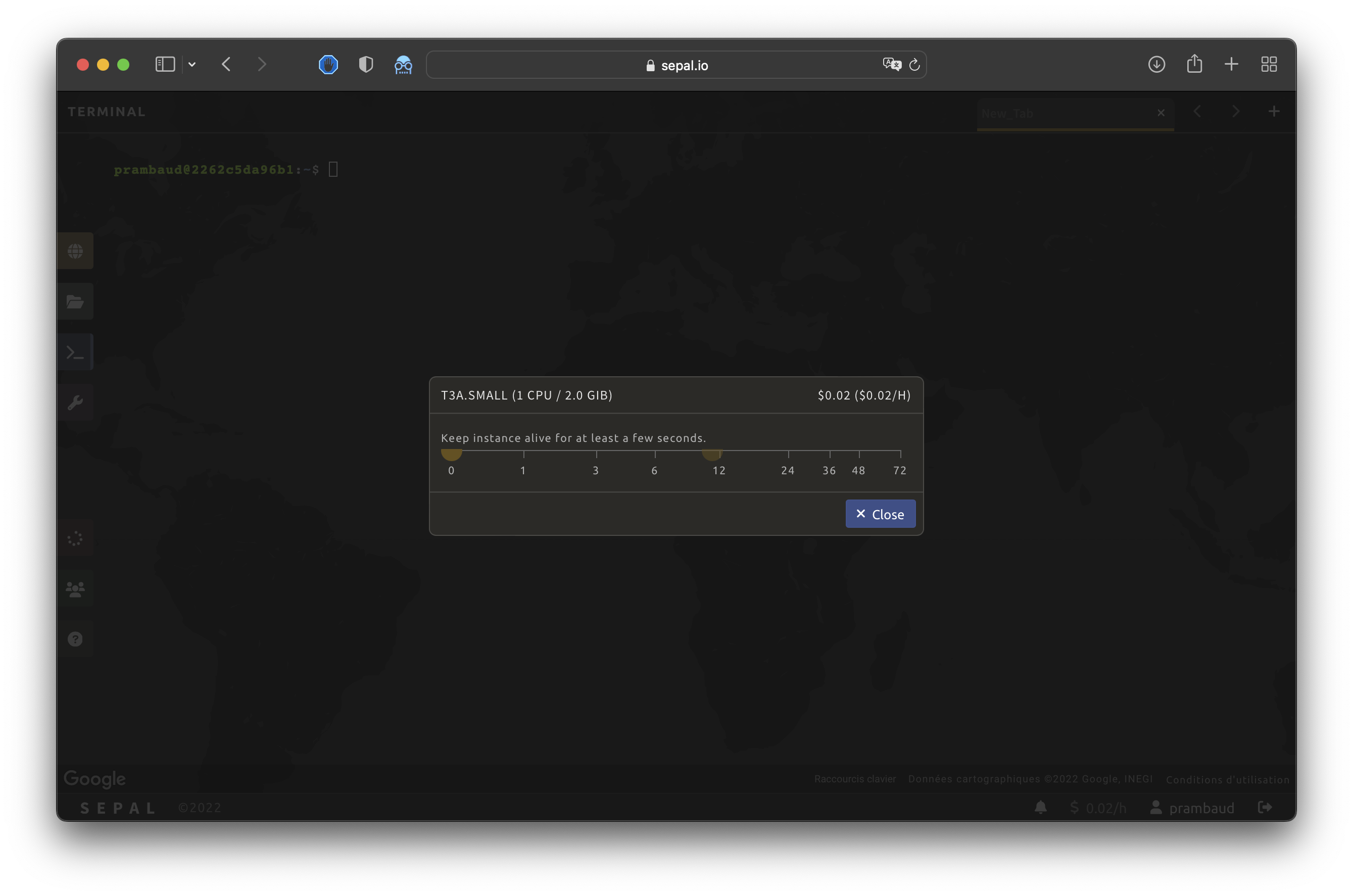 Select Edit to open the Instance pop-up window, where the slider bar displays the amount of time remaining before your instance will be shut down. Increase this value for the estimated duration of your process and you can then safely close the SEPAL browser tab.