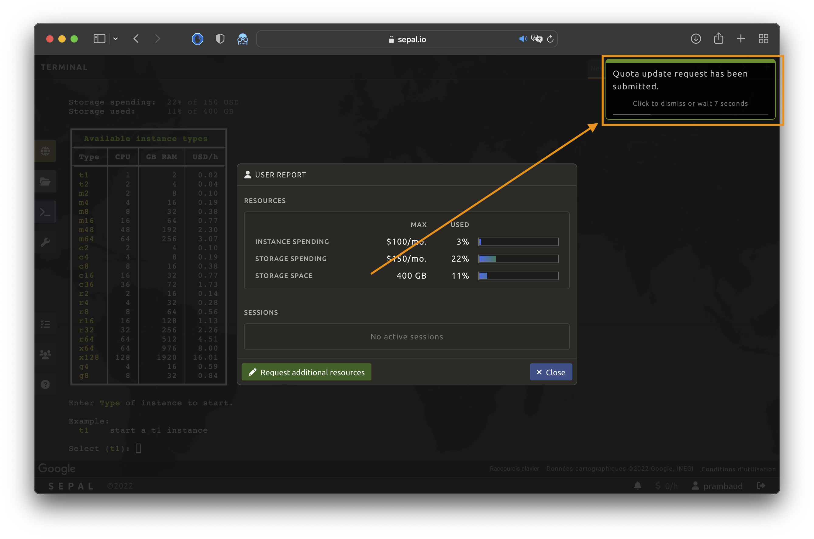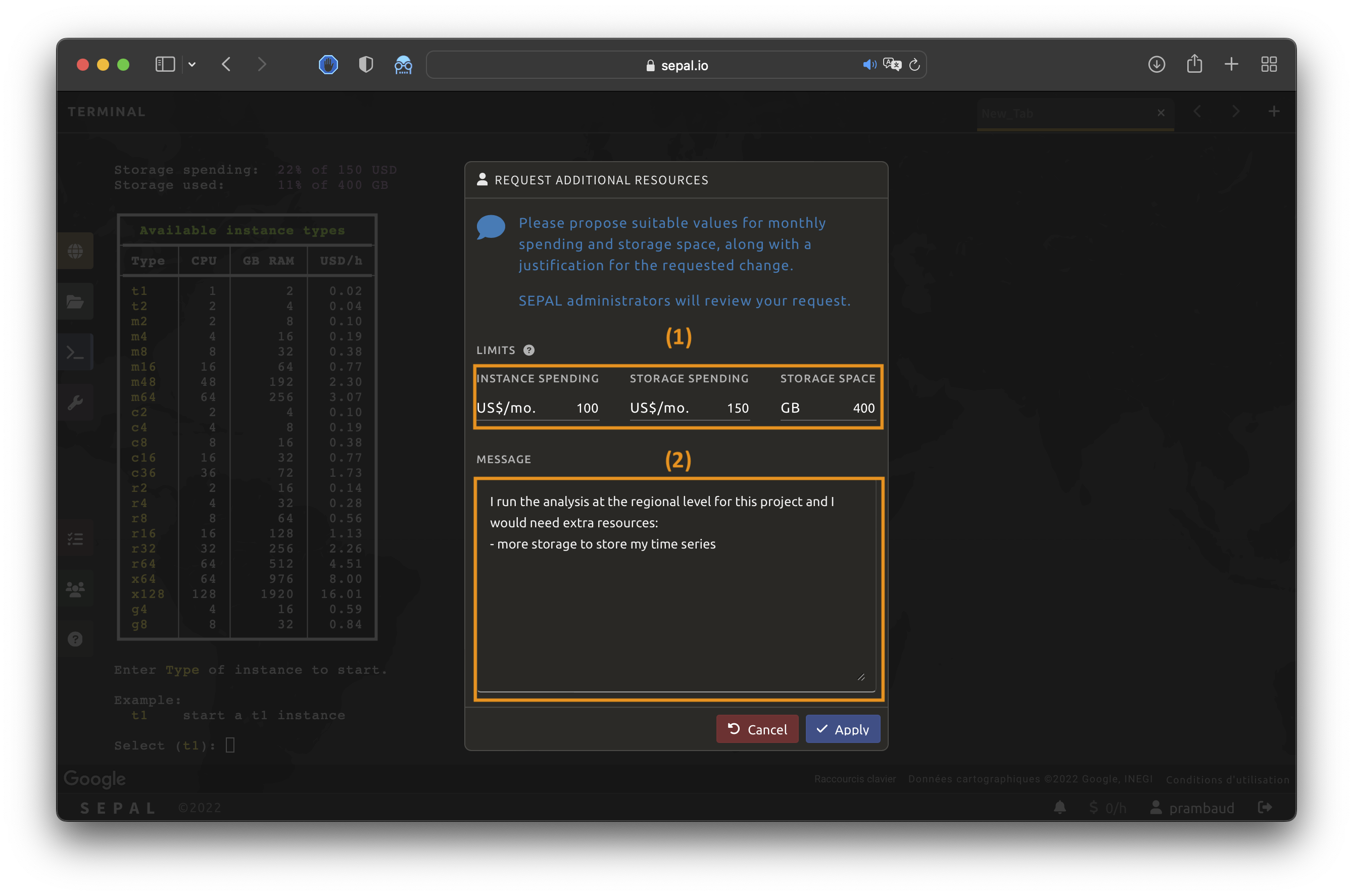 Some actions or projects may require more storage to perform analysis at the province or country level; other actions or projects may require more instances to perform heavier computation processes. If you need more storage or instances, you can submit a quota request to the SEPAL team by following the instructions below.