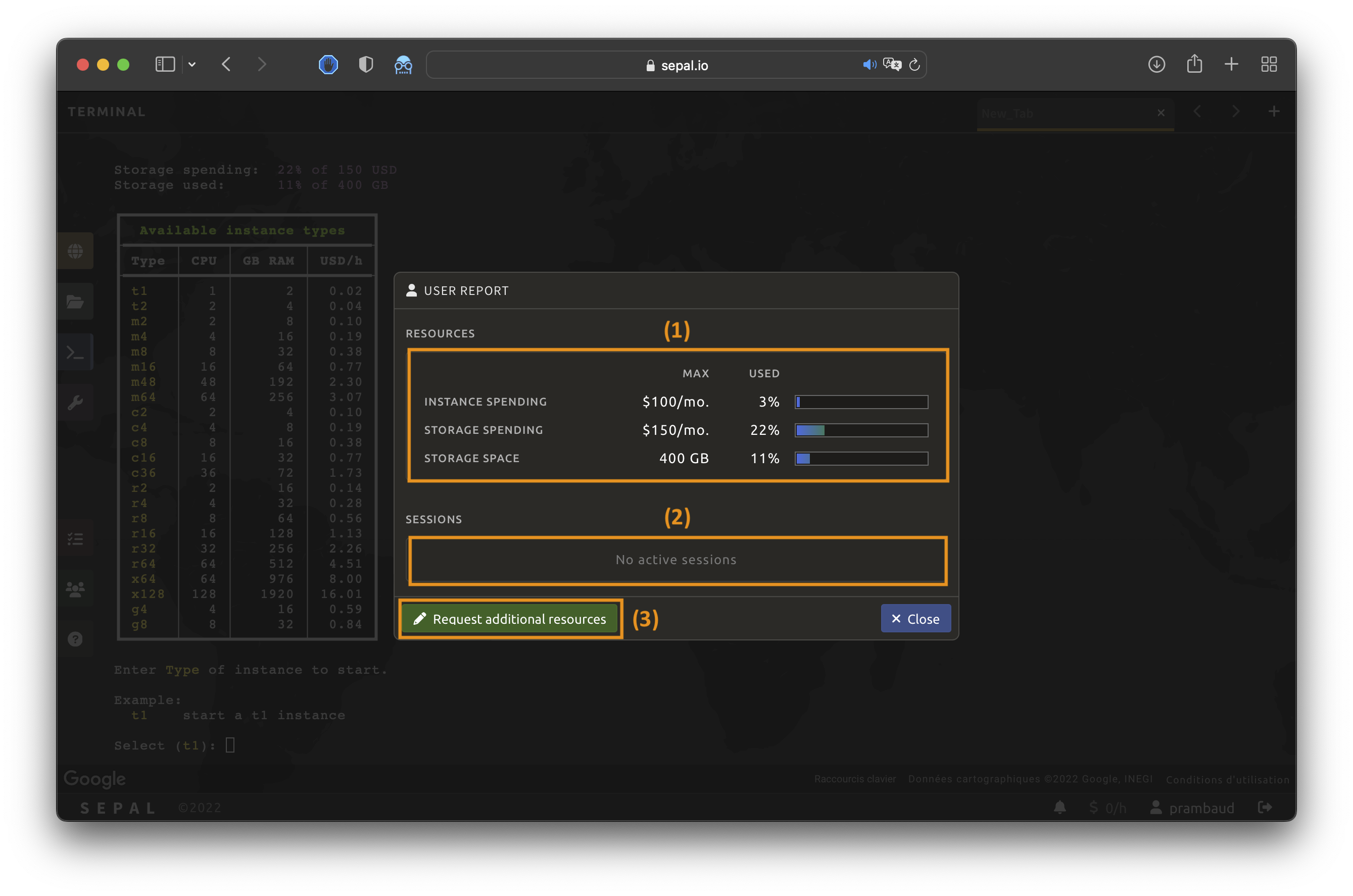 In the User report pop-up window, each line represents a different instance, where you can see their technical features and hourly quota consumption.