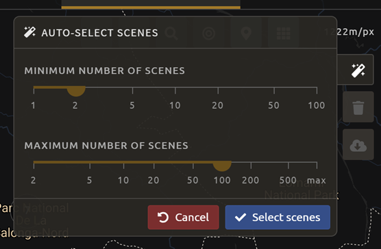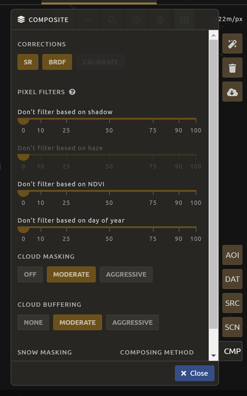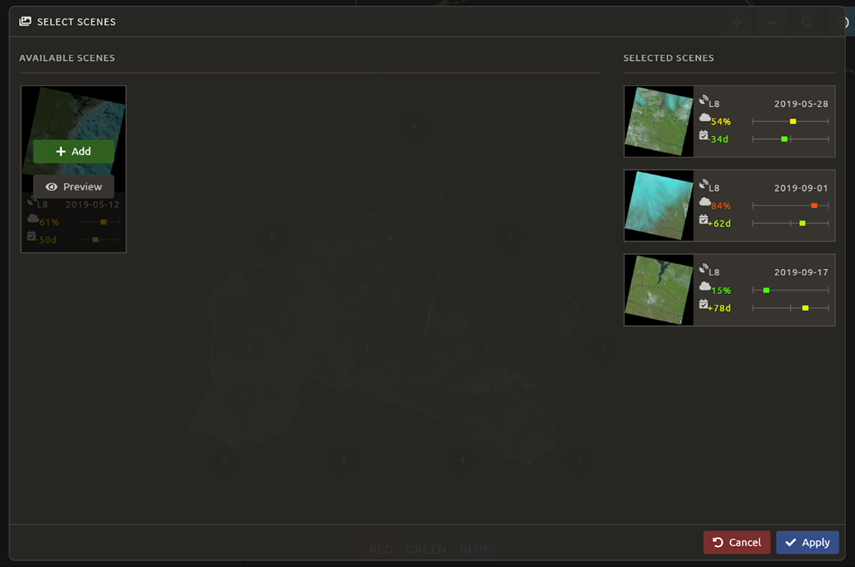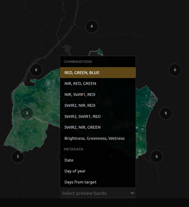 Past SeasonsandFuture Seasonsslider. This will include additional years’ data of the same dates specified (if you’re interested in August 2015, including one future season will also include data from August 2016). (This is useful if you’re interested in a specific time of year, but there is significant cloud cover.)For this exercise, let’s create imagery for the dry season of 2019.