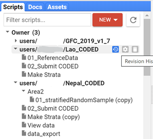 GEE has implemented version control and version history for all scripts and repositories written on the platform. To access the version control, Select the history icon next to a script in order to compare or revert it to an older version.