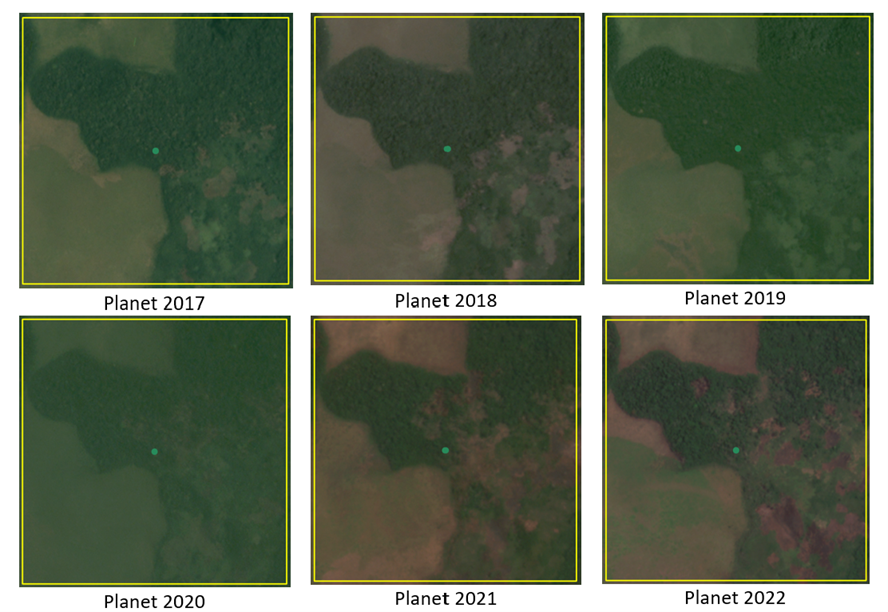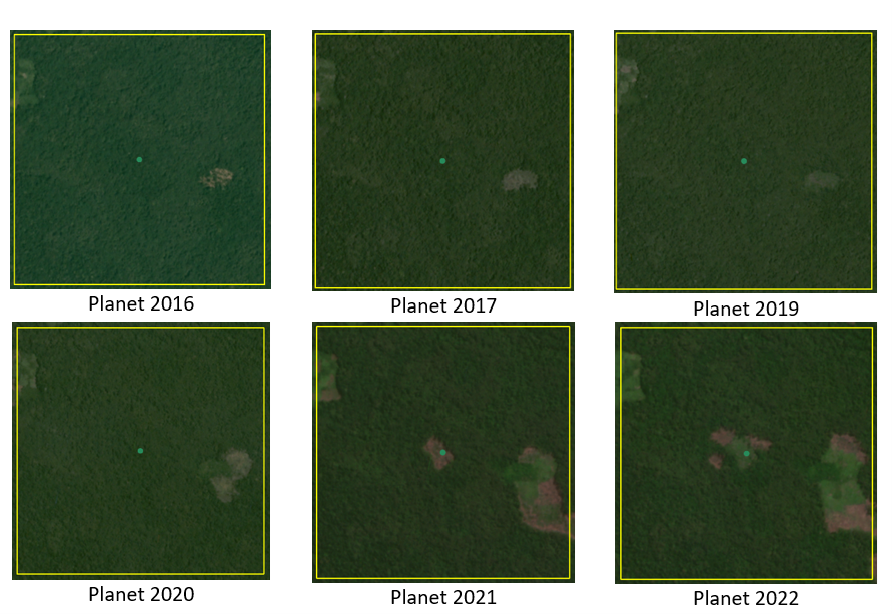 Deforestation is recognizable in images by a permanent change in forest cover. In high-resolution images, we can often see bare ground, felled trees, and sometimes the beginning of agriculture or other driving activities.