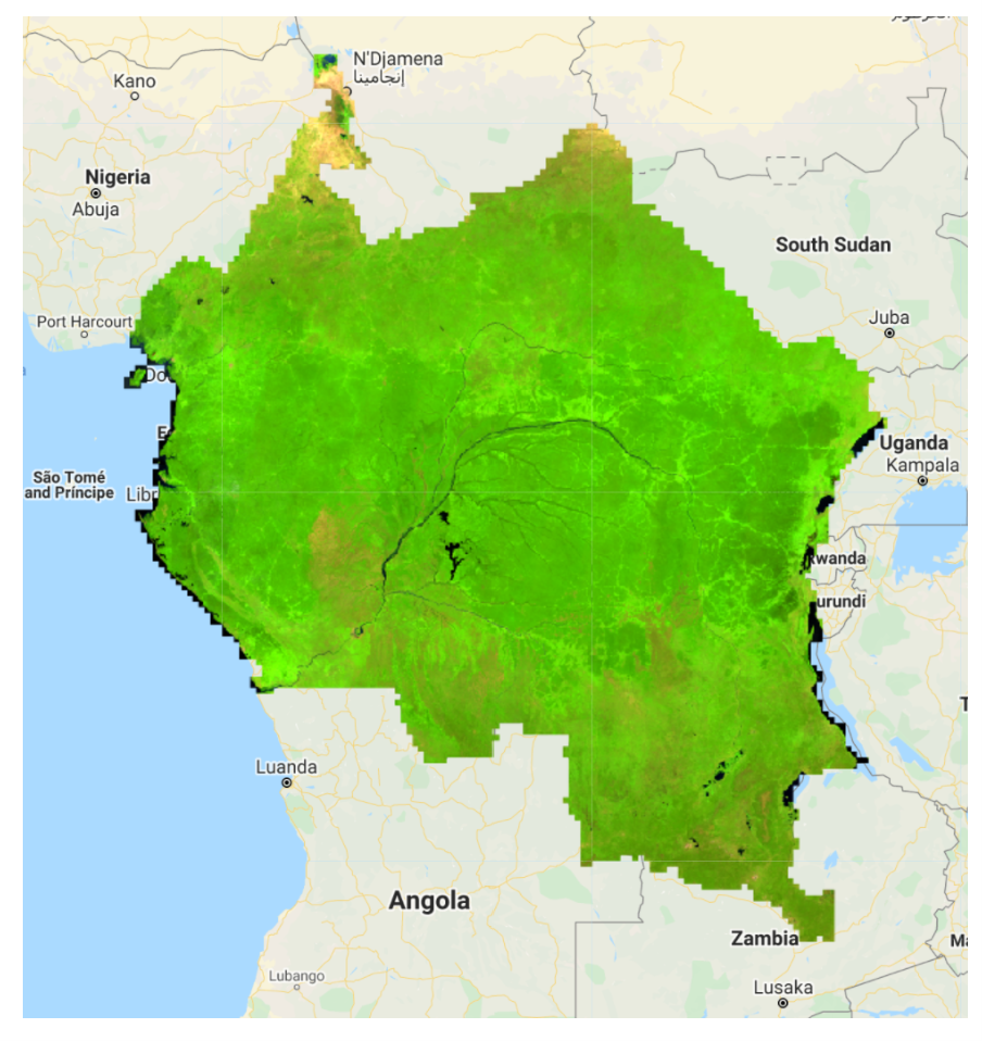Once the export is finished, you can view the asset in GEE or SEPAL (see figure below of the 2015 mosaic of the Congo Basin using the above parameters).