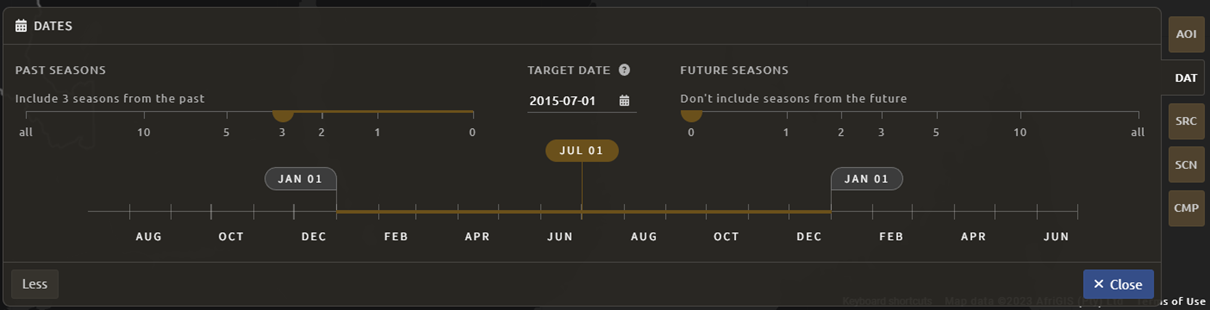 For the dates, you can enter a year, a date range or a single date. When you add a year or date range, SEPAL will provide a “time-scan” composite that includes bands which are statistical metrics of the range of data, including phase and amplitude, which assess the phenology and variations within the time period.