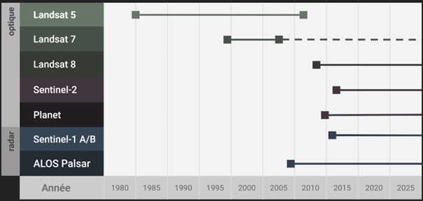 We evaluated the availability of Landsat 4, 5, 7 and 8 images for the creation of optical mosaics for the baseline year (2015). As you can see from the figure below, only certain sensors are available for certain time periods – from 2003 onwards the Landsat 7 sensor experienced a malfunction which results in data gaps in strips. This sensor should be only included when necessary (i.e. when not enough imagery is available). Luckily in SEPAL, the selection of sensors is automatic based on the selected date and only provides the available options.