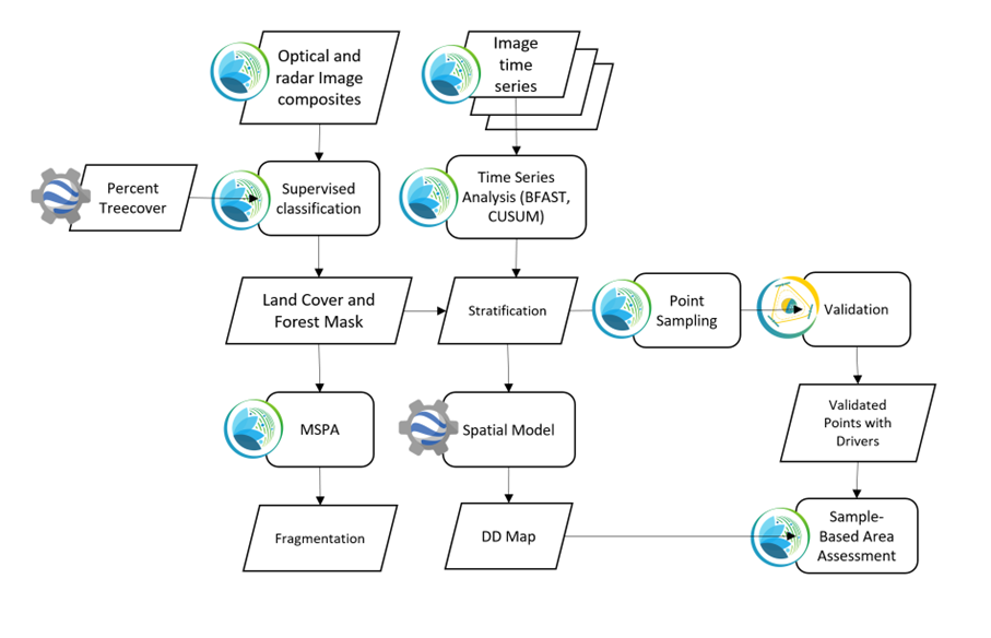 The methodology uses FAO’s Open Foris Suite of Tools, including the SEPAL platform, for satellite data analysis, as well as Collect Earth Online (CEO) and Google Earth Engine (GEE). The approach analyses dense satellite time series to generate geospatial data on forest changes, which are then validated and interpreted for direct drivers in five major steps: