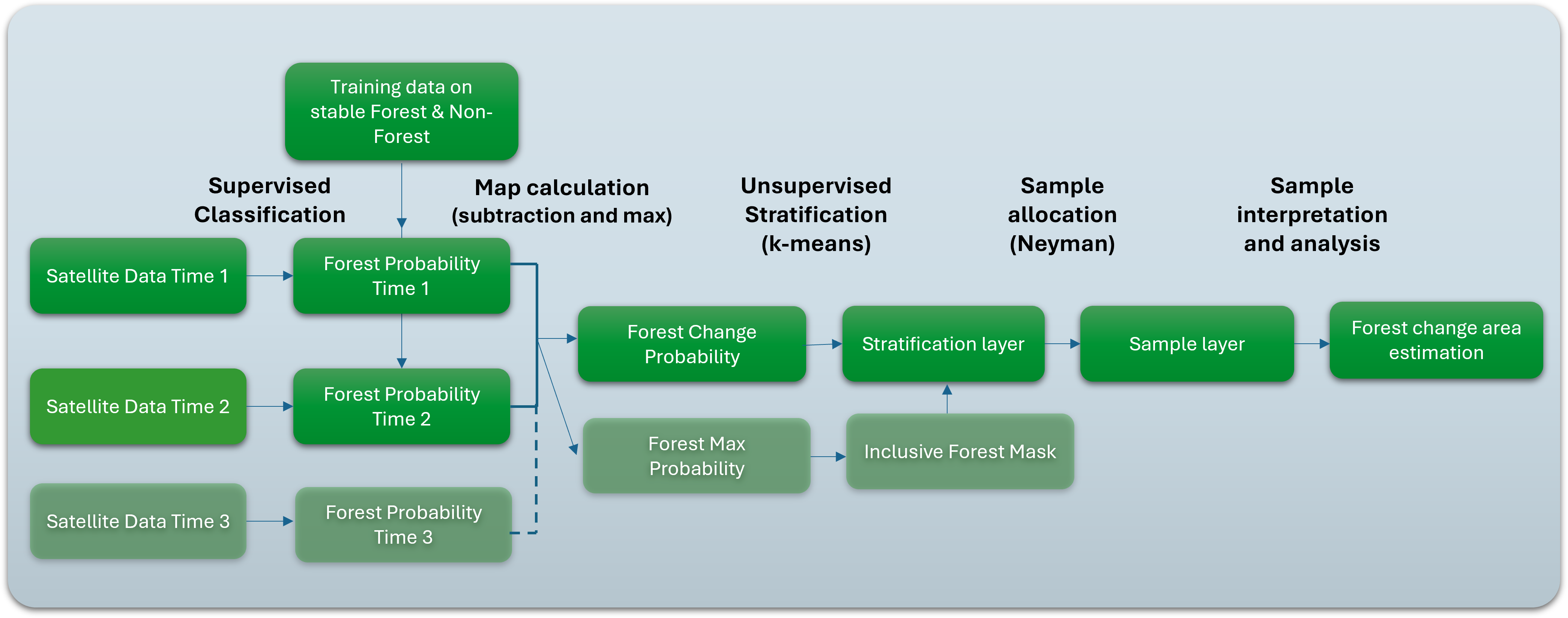 This tutorial provides a step-by-step guide to estimate forest change areas between two dates using an improved area estimation technique. The method leverages a statistically optimized stratification of forest and forest change areas using continuous probability layers and sample allocation.